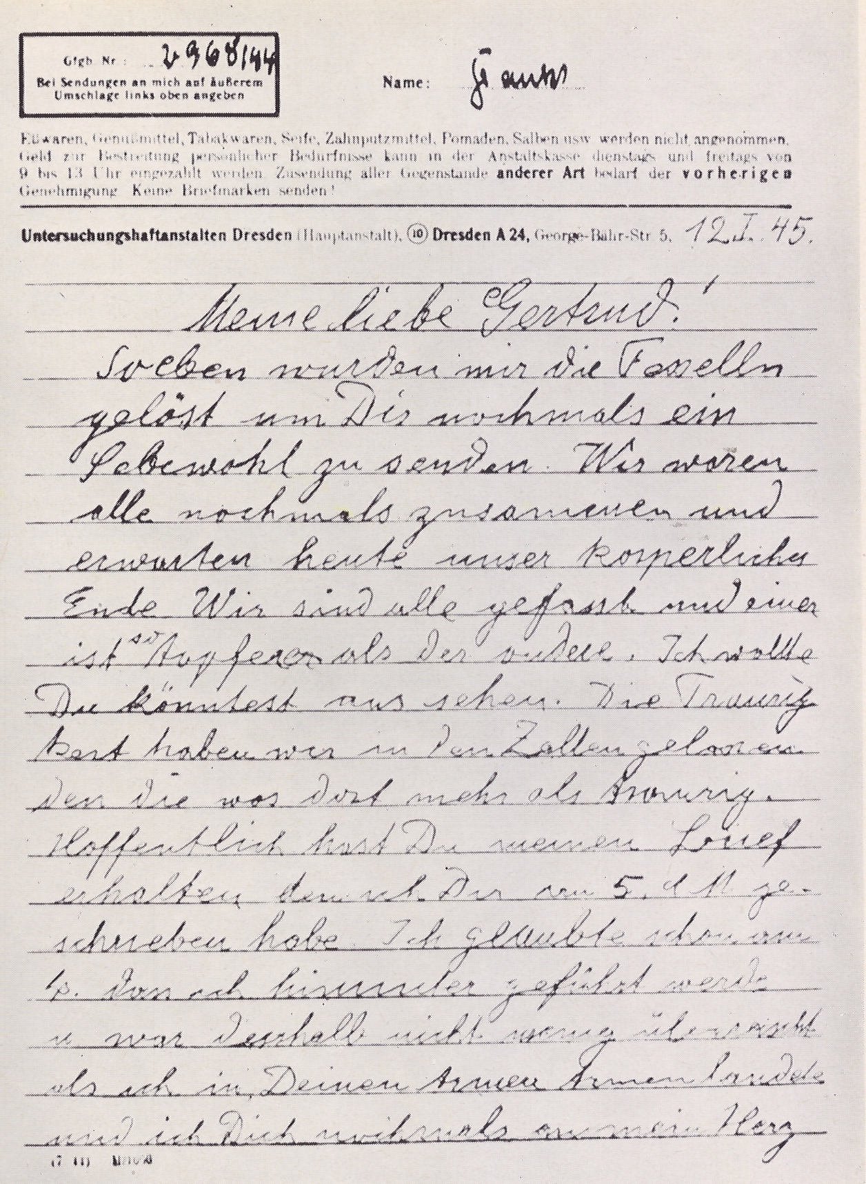 "Meine liebe Gertrud! Soeben wurden mir die Fesseln gelöst, um Dir nochmals ein Lebewohl zu senden. Wir waren alle nochmals zusammen und erwarten heute unser körperliches Ende. Wir sind gefasst und einer so tapfer wie der andere. Ich wollte Du könntest uns sehen. Die Traurigkeit haben wir in der Zelle gelassen. Hoffentlich hast Du meinen Brief erhalten, den ich Dir am 3. d. M. geschrieben habe. Ich glaubte, dass ich schon am 4. hinuntergeführt würde, und war deshalb nicht wenig überrascht, als ich in Deinen Armen landete und ich Dich nochmals an mein Herz drücken konnte."
