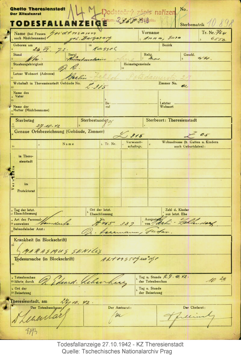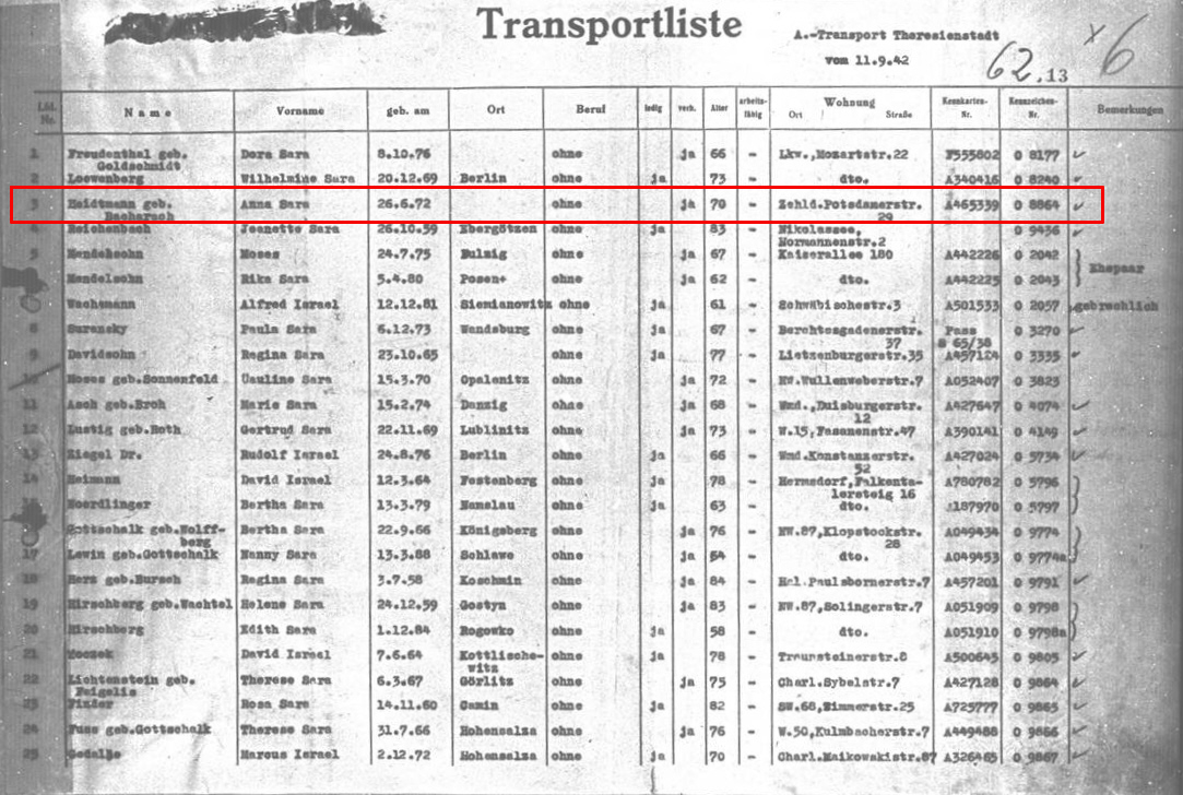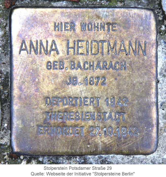 Der 11. September 1942 war ein Freitag. An diesem Tag begann der Transport I/64 der Jüdischen Mitbürger aus dem Jüdischen Altersheim an der Großen Hamburger Straße 26, wo sich auch Anna Heidtmann einfinden musste, zum Anhalter Bahnhof. Mit einem an einen fahrplanmäßigen Personenzug angehängten Waggon fuhr der Zug über Dresden nach Bauschowitz im Sudentenland, heute Bohušovice in Tschechien. Vom Bahnhof in Bauschowitz ging es die letzten drei Kilometer zu Fuß in das KZ Theresienstadt. Hier wurde Anna Bacharach eineinhalb Monate später ermordet. Sie ist 70 Jahre alt. Die "Todesursache" lautete wie fast immer, "Altersschwäche". Im Jahre 2006 wurde zu ihrem Gedenken von der Initiative Stolpersteine Berlin einer der ersten Steine in Berlin überhaupt, vor ihrem letzten Wohnort in der Potsdamer Straße 29 in Zehlendorf verlegt.