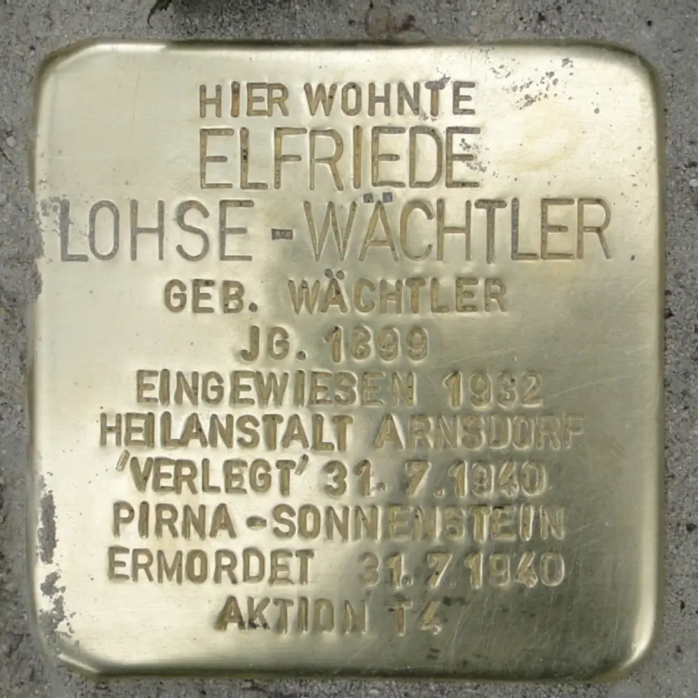 Die andauernden Probleme mit ihrem Vater beförderten ihre Krankheit weiter. Im März 1932 wird sie in die Psychiatrie des Dresdner Stadtkrankenhauses eingeliefert und im Juni 1932 in die Landesanstalt Arnsdorf bei Dresden verlegt. Als die Nazis 1933 an die Macht kamen, ahnte niemand, in welch tödlicher Gefahr geistig behinderte und psychisch kranke Menschen plötzlich waren. Auch Elfriedes Eltern haben das zu spät erkannt und es nicht mehr geschafft, ihre Tochter wieder zu sich nach Hause zu holen. Am 31. Juli 1940 wurde Elfriede Lohse-Wächtler im Rahmen der Euthanasieaktion T4 mit dem Bus in die Tötungsanstalt „Sonnenstein“ bei Pirna transportiert, wo sie noch am gleichen Tag in der als Dusche getarnten Gaskammer im Keller des Hauses mit Kohlenmonoxid ermordet wurde.