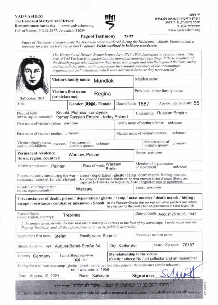 Der Kunsthistoriker Otto Schneid, der Regina Mundlak persönlich kannte, berichtete nach dem Krieg in noch erhaltenen Dokumenten, dass ihr Werk damals "aus einer unvorstellbaren Menge von Zeichnungen, jedenfalls Tausenden, die von Miniaturen bis zu ganzen Figuren in Lebensgröße reichten", bestand. Leider wurde fast ihr komplettes Werk in den Wirren des Zweiten Weltkrieges vernichtet und deshalb ist es wichtig, dass man die wenigen Werke, die heute noch existieren, öffentlich zugänglich macht.