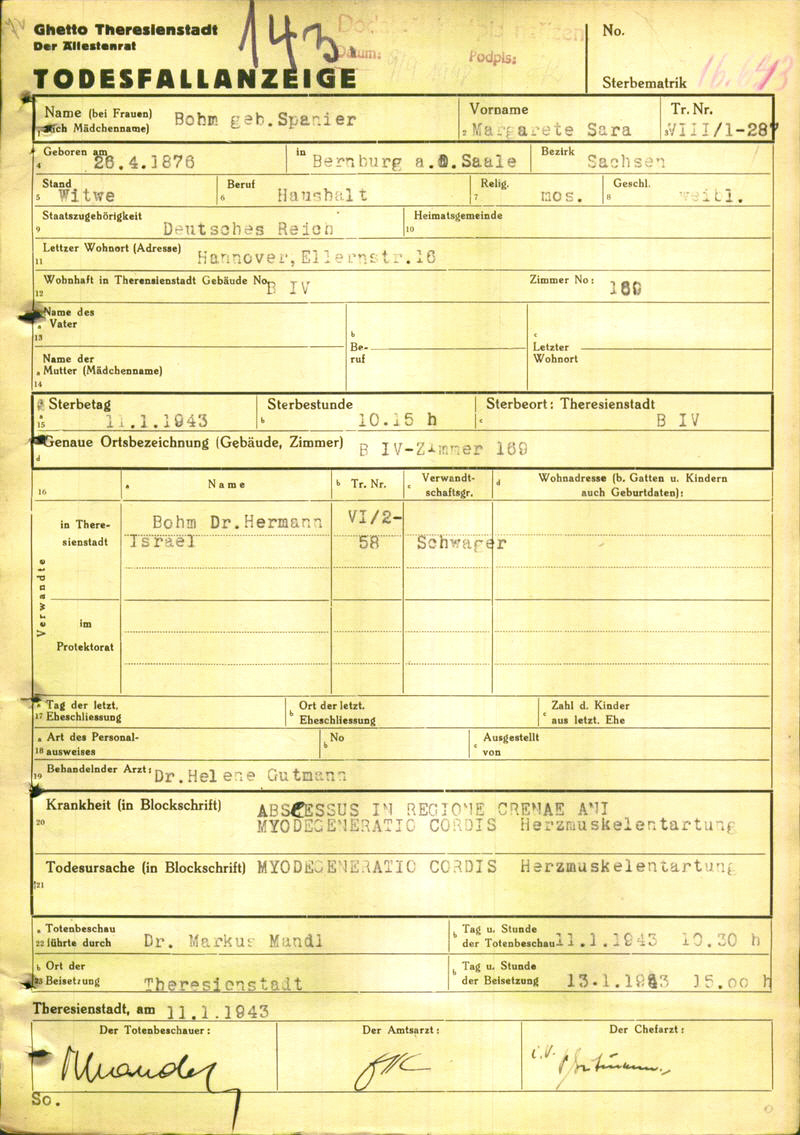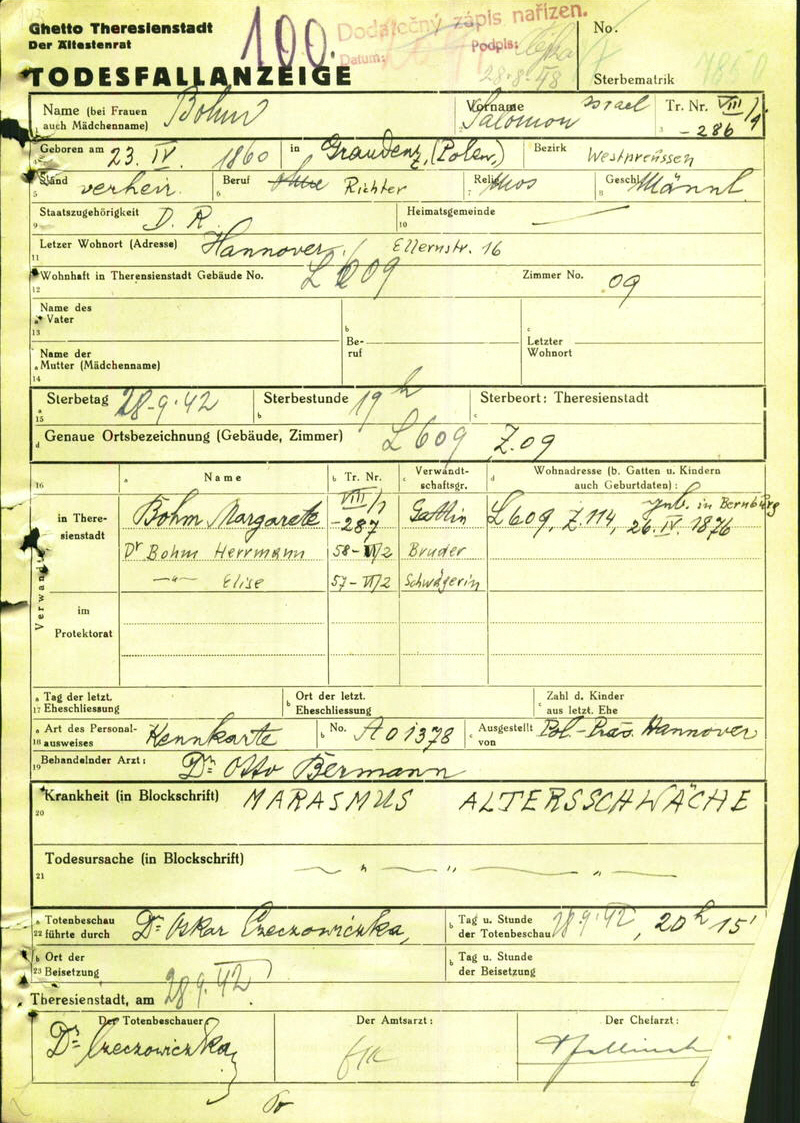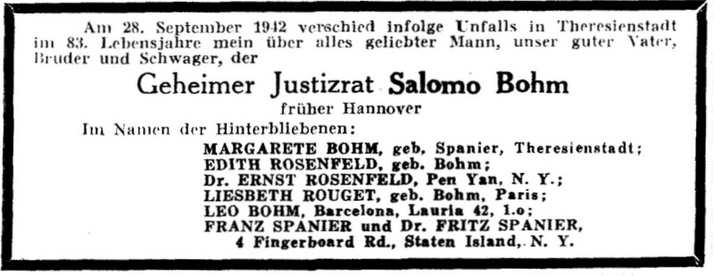 Die Eltern haben am 18.03.1897 in Bernburg an der Saale geheiratet. Dort wurde Margarete Spanier am 26.04.1876 auch geboren. Salomo Bohm kam am 23.04.1860 in Graudenz, damals Westpreußen, heute Polen, zur Welt. Beide wurden am 24.07.1942 von Hannover in das "Ghetto" Theresienstadt deportiert. Salomo Bohm starb dort am 28.09.1942 - seine Frau Margarete vier Monate später am 11.02.1943. In den Todesfallanzeigen des "Ghettos" werden in der Regel medizinische Gründe für den Tod angegeben. Es ist allerdings davon auszugehen, dass die Menschen dort ermordet wurden. Auch die offizielle Bezeichnung "Ghetto" war eine Täuschung der Opfer, denn auch Theresienstadt war ein KZ. Der letzte Wohnort der Familie vor der Deportation war das sogenannte "Judenhaus" in der Ellernstraße 16. Es war das ehemalige jüdische Krankenhaus und Pflegeheim. Da Salomo Bohm ab 1940 nicht mehr im Adressverzeichnis von Hannover zu finden ist, ist davon auszugehen, dass er und seine Frau schon 1939 in dieses Haus eingewiesen wurden. Am 23. Juli 1942 wurden die letzten Patienten und zwangseingewiesenen Juden, insgesamt 148 Personen, nach Theresienstadt transportiert, darunter Elisabeths Eltern, der Bruder ihres Vaters und dessen Frau. Ihre Schwester Edith wurde am 17.04.1898 in Konitz geboren und ist 1978 in New York gestorben. Sie war verheiratet mit dem 1886 in Neuwied geborenen Arzt Dr. Ernst Rosenfeld. Beide reisten im Januar 1939 von Rotterdam nach New York und haben dort am 16.01.1939 die amerikanische Staatsbürgerschaft beantragt.