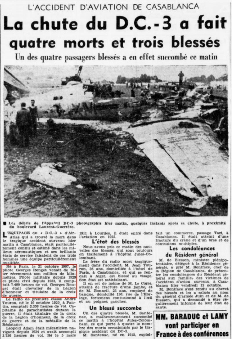 Am 02.04.1947 wurde die Ehe zwischen Elisabeth und Georges in Casablanca geschieden - vermutlich in Abwesenheit von Elisabeth. Georges Ronget kam drei Jahre später - am 13.10.1950 - als Pilot einer DC-3 beim Absturz seines Flugzeuges in der Nähe von Casablanca ums Leben. Da er in der Todesanzeige für Elisabeths Vater nicht erwähnt wird, könnte man davon ausgehen, dass sie schon 1942 nicht mehr zusammen waren. In dieser Anzeige wird Elisabeths Nachname mit "ROUGET" angegeben. Deshalb ist es auch denkbar, dass der Name "RONGET" dort bewusst nicht erwähnt wird, weil Georges Ronget zu dieser Zeit als Widerstandskämpfer im besetzten Frankreich aktiv war.
