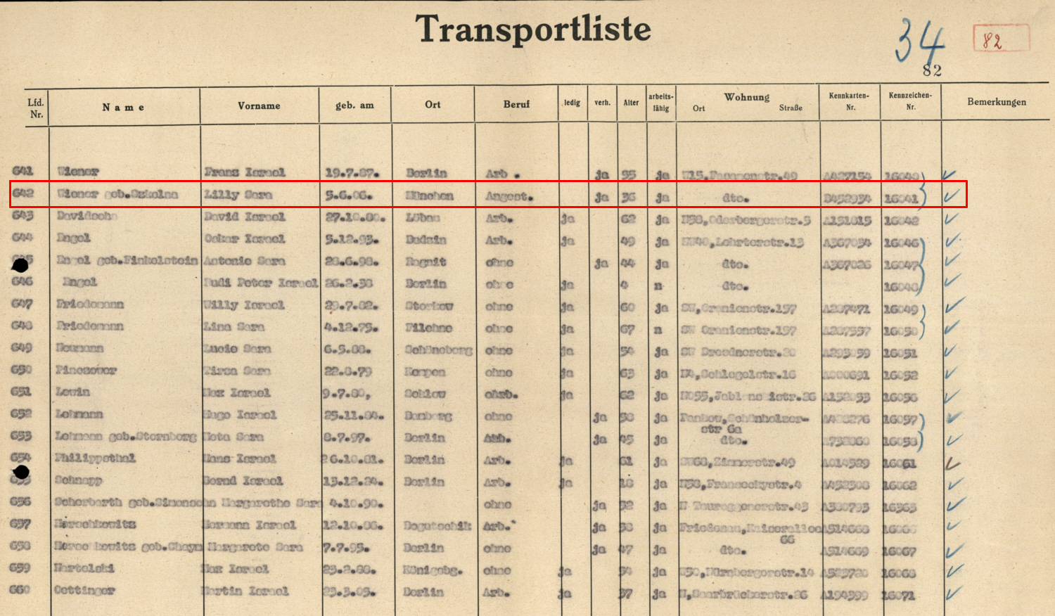 Lilli Szkolny wurde am 5. Juni 1906 als ältestes von drei Kindern in eine jüdische Familie in München geboren. Ihre Eltern waren Franz Szkolny und Frieda Selz. Franz Szkolny war Numismatiker und Mitinhaber einer Münchner Münzenhandlung. Er starb 1935 mit 58 Jahren in München. Ihre Mutter Frieda wählte am 25. August 1941 im Alter von 56 Jahren in München den Freitod, als ihr mitgeteilt wurde, dass sie deportiert wird. Lilli Szkolny war verheiratet mit Franz Wiener, der am 19. Juli 1887 in Berlin geboren wurde. Die Hochzeit fand Ende 1941 oder Anfang 1942 statt. Am 15. August 1942 wurden beide mit dem 18. Osttransport in das jüdische Ghetto in Riga deportiert, wo sie nur wenige Tage später, am 18. August, ermordet wurden. Der letzte Wohnort vor der Deportation war laut Eintrag in der Deportationsliste die Fasanenstraße 49 in Berlin Wilmersdorf.