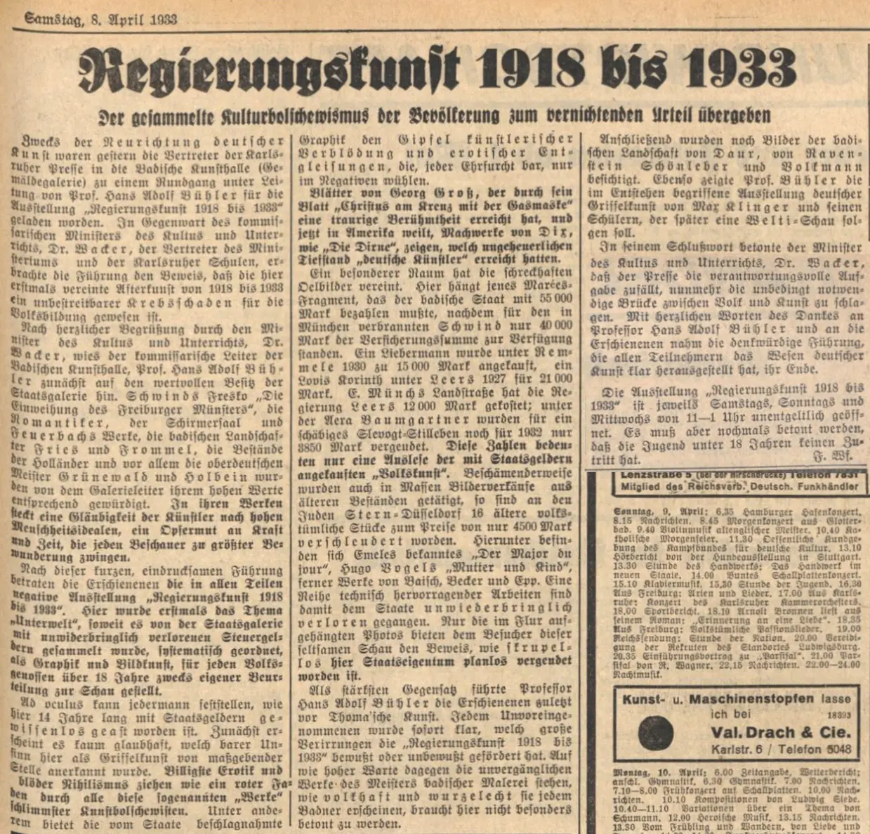 Der Kultusminister Dr. Wacker bestimmte, dass die badische Bevölkerung selbst Einsicht nehme in die Kunstwerke der ,Kulturepoche von 1918-1933‘. In allernächster Zeit wird eine Zusammenstellung jener bolschewistischen und krankhaften Werke erfolgen, die in dieser Zeit von der Regierung angekauft wurden. Unter jedem Bild soll der Preis sichtbar sein und der Name des jeweiligen Kultusministers, der die Verantwortung trug. Dann muss eine Völkerwanderung zur Kunsthalle einsetzen, und wir wissen, dass die Besucher ein einstimmiges Urteil fällen werden über jene vergangene Epoche, in der alles getan wurde, unser arteigenes, geistiges Leben zu zerschlagen.“